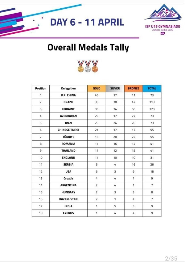 کاروان ایران نیز با ٢٣ مدال طلا، ٢۴ نقره و ٢۶ برنز در جایگاه پنجم ایستاده و برزیل، اوکراین و آذربایجان نیز در ردههای دوم تا چهارم ایستادهاند.