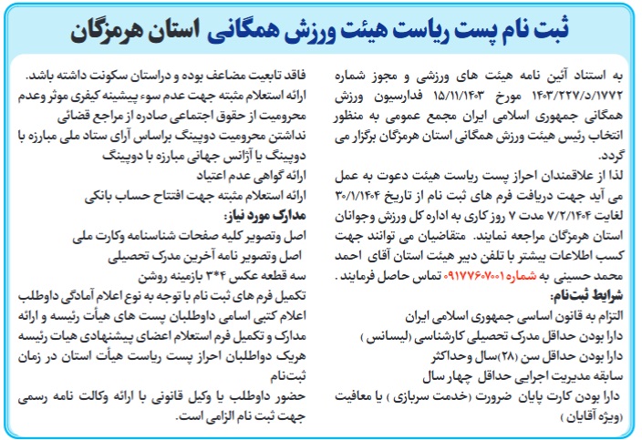 لذا از علاقهمندان احراز پست ریاست هیئت دعوت به عمل میآید از تاریخ ۱۴۰۳/۱/۲۶ لغایت ۱۴۰۳/۲/۱۴ با در دست داشتن مدارک مشروحه ذیل جهت ثبتنام از ساعت ۸ الی ۱۳ (روزهای اداری) به دفتر امور مجامع واقع در بندرعباس، چهارراه مرادی، طبقه فوقانی استادیوم تختی، اداره کل ورزش و جوانان استان مراجعه نمایند.