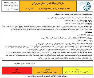 به گزارش صبح ساحل، مهرداد حسنزاده، مدیرکل مدیریت بحران استانداری هرمزگان از صدور هشدار دریایی سطح نارنجی برای آبهای استان خبر داد و اظهار داشت: بر اساس پیشبینی هواشناسی هرمزگان، از بعدازظهر امروز سهشنبه ۲۶ فروردینماه تا عصر جمعه ۲۹ فروردین، وزش باد شدید شمال غربی و مواج شدن دریا در خلیج فارس، تنگه هرمز و دریای عمان پیشبینی شده است.