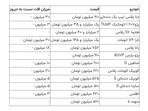 با توجه به کاهش قیمت دلار، قیمت خودرو نیز که با ورود به سال جدید افزایش یافته بود، روند کاهشی به خود گرفته و بین ۵ تا ۲۰ میلیون تومان افت قیمت خورده است.