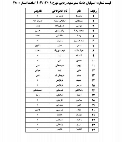 اسامی متوفیان حادثهٔ تأسفبار بندر شهید رجایی به شرح زیر اعلام شده است:
