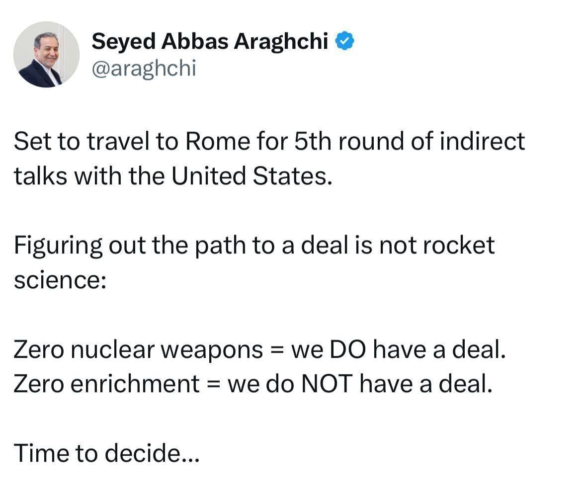 وزیر امور خارجه کشورمان نوشت: برای دور پنجم مذاکرات غیرمستقیم با آمریکا عازم رم هستم.