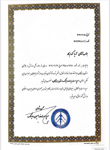 «به موجب این ابلاغ و با عنایت به تعهد، تخصص و تجارب جنابعالی، به سمت سرپرست هیأت روئینگ استان هرمزگان منصوب میشوید. امید است با اتکال به خداوند متعال و در راستای سیاستهای وزارت ورزش و جوانان، در انجام امور محوله موفق و مؤید باشید.»