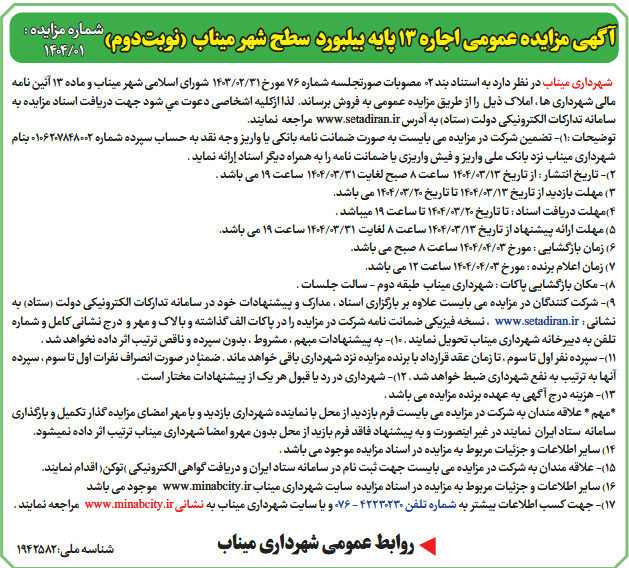 آگهی مزایده عمومی اجاره 13 پایه بیلبورد سطح شهر میناب (نوبتدوم)