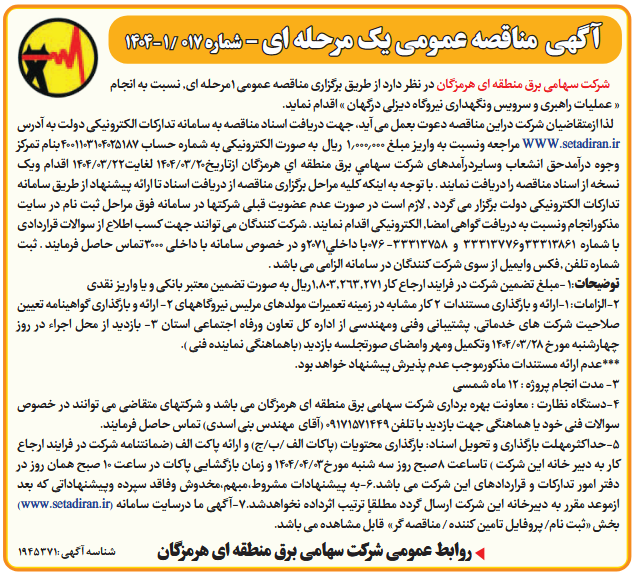 لذا ازمتقاضيان شرکت دراین مناقصه دعوت بعمل می آید، جهت دریافت اسناد مناقصه به سامانه تدارکات الکترونیکی دولت به آدرس WWW.setadiran.ir مراجعه ونسبت به واریز مبلغ 1.000.000 ریال به صورت الکترونیکی به شماره حساب 4001103104025187بنام تمرکز وجوه درآمدحق انشعاب وسایردرآمدهای شركت سهامي برق منطقه اي هرمزگان ازتاريخ20/03/1404 لغايت22/03/1404 اقدام ویک نسخه از اسناد مناقصه را دریافت نمایند . با توجه به اینکه کلیه مراحل برگزاری مناقصه از دریافت اسناد تا ارائه پیشنهاد از طریق سامانه تدارکات الکترونیکی دولت برگزار می گردد , لازم است در صورت عدم عضویت قبلی شرکتها در سامانه فوق مراحل ثبت نام در سایت مذکورانجام ونسبت به دریافت گواهی امضا, الکترونیکی اقدام نمایند . شرکت کنندگان می توانند جهت کسب اطلاع از سوالات قراردادی با شماره 33313861و33313776 و 33313758- 076با داخلي2071و در خصوص سامانه با داخلی 3000تماس حاصل فرمایند . ثبت شماره تلفن ,فکس وایمیل از سوی شرکت کنندگان در سامانه الزامی می باشد .