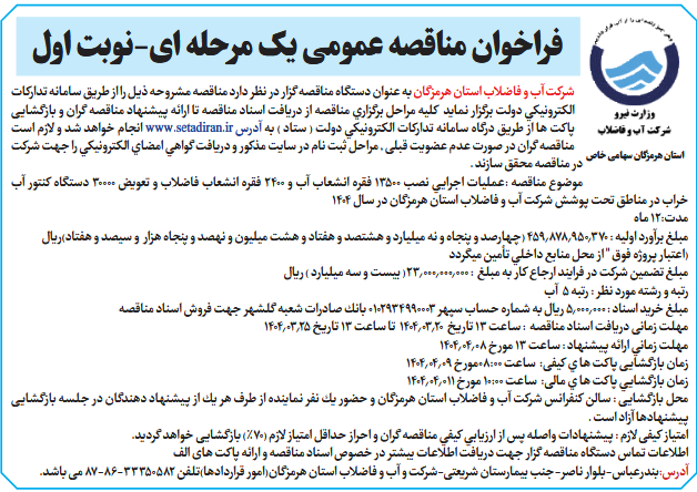 شركت آب و فاضلاب استان هرمزگان به عنوان دستگاه مناقصه گزار در نظر دارد مناقصه مشروحه ذيل را از طريق سامانه تداركات الكترونيكي دولت برگزار نمايد كليه مراحل برگزاري مناقصه از دريافت اسناد مناقصه تا ارائه پيشنهاد مناقصه گران و بازگشايی پاكت ها از طريق درگاه سامانه تداركات الكترونيكي دولت ( ستاد ) به آدرس www.setadiran.ir انجام خواهد شد و لازم است مناقصه گران در صورت عدم عضويت قبلی , مراحل ثبت نام در سايت مذكور و دريافت گواهي امضاي الكترونيكي را جهت شركت در مناقصه محقق سازند .