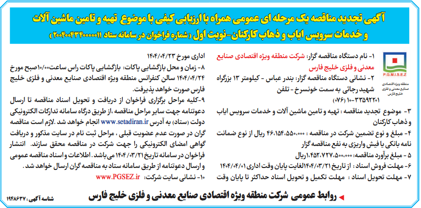 1- نام دستگاه مناقصه گزار: شرکت منطقه ویژه اقتصادی صنایع معدنی و فلزی خلیج فارس