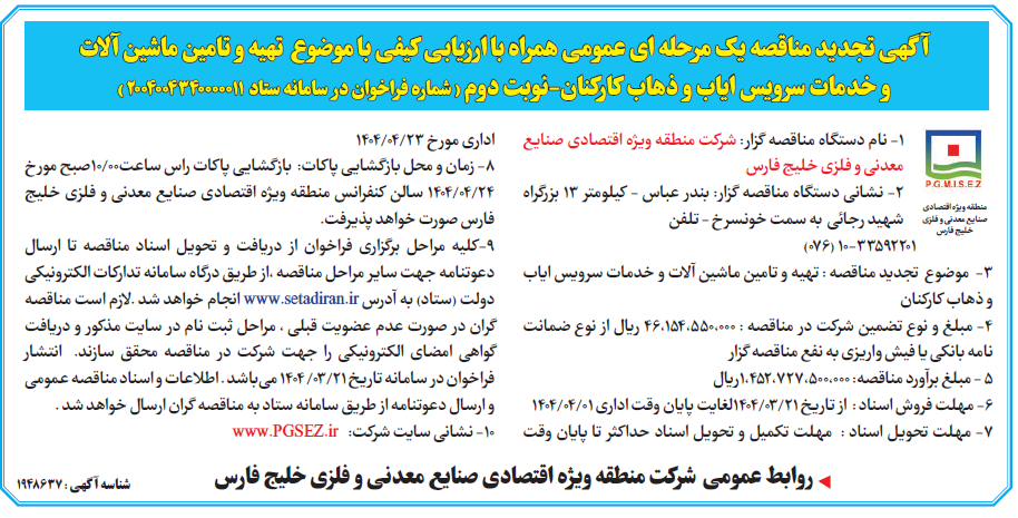آ گهی تجدید مناقصه یک مرحله ای عمومی همراه با ارزیابی کیفی با موضوع تهیه و تامین ماشین آلالات ) و خدمات سرویس ایاب و ذهاب کارکنان-نوبت دوم