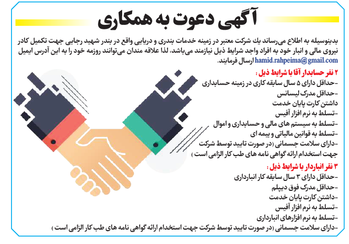 بدينوسيله به اطلاع م یرساند يك شركت معتبر در زمینه خدمات بندری و دريايی واقع در بندر شهید رجايی جهت تکمیل کادرنيروی مالی و انبار خود به افراد واجد شرایط ذیل نیازمند م یباشد، لذا علاقه مندان م یتوانند روزمه خود را به این آدرس ایمیلارسال فرمایند