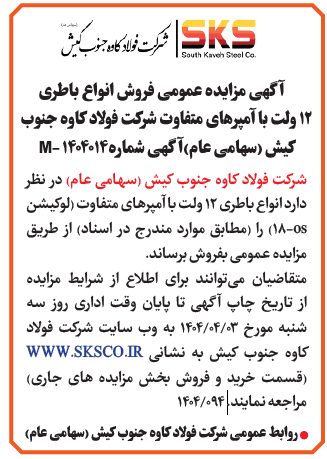 آ گهی مزایده عمومیفروش انواع باطری 12 ولت با آمپرهای متفاوت