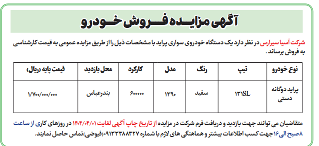 شرکت آسیا سیرارس در نظر دارد یک دستگاه خودروی سواری پراید با مشخصات ذیل را از طریق مزایده عمومی به قیمت کارشناسی به فروش برساند .