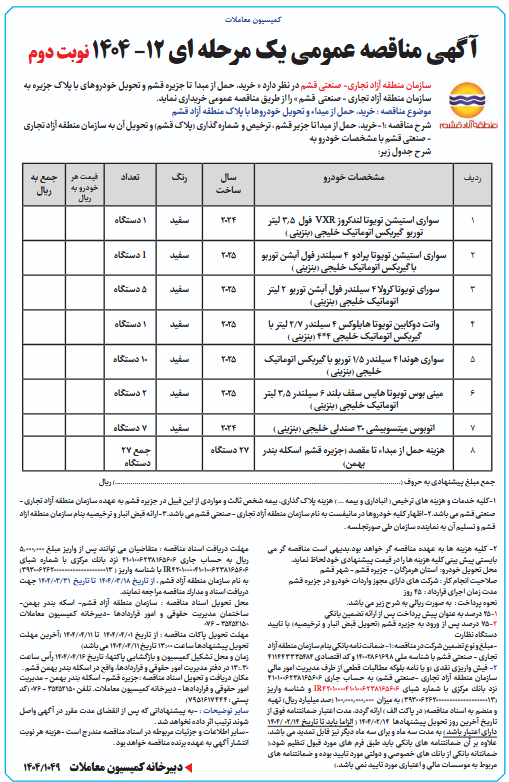 موضوع مناقصه : خرید، حمل از میداء و تحویل خودروها با پلاک منطقه آزاد قشم