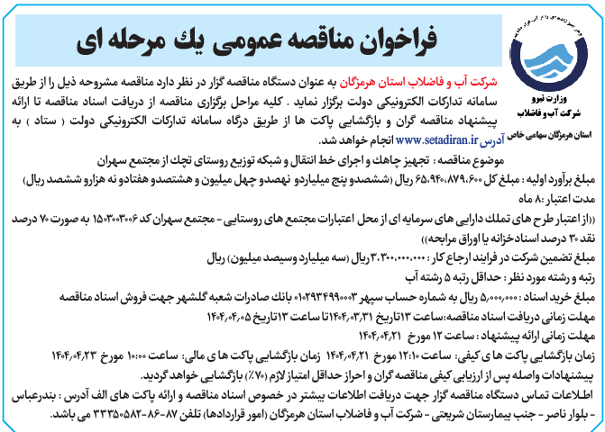 شركت آب و فاضلاب استان هرمزگان به عنوان دستگاه مناقصه گزار در نظر دارد مناقصه مشروحه ذیل را از طریق