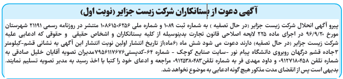 شرکت زیست جزایر )در حال تصفیه( دارند دعوت می شود شش ماه ) 6ماه(از تاریخ انتشار اولین نوبت انتشار این آ گهی به نشانی قشم-کیلومتر
