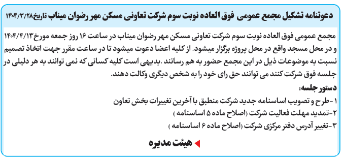 مجمع عمومی فوق العاده نوبت سوم شرکت تعاونی مسکن مهر رضوان میناب در ساعت ۱6 روز جمعه مورخ 1404/4/13