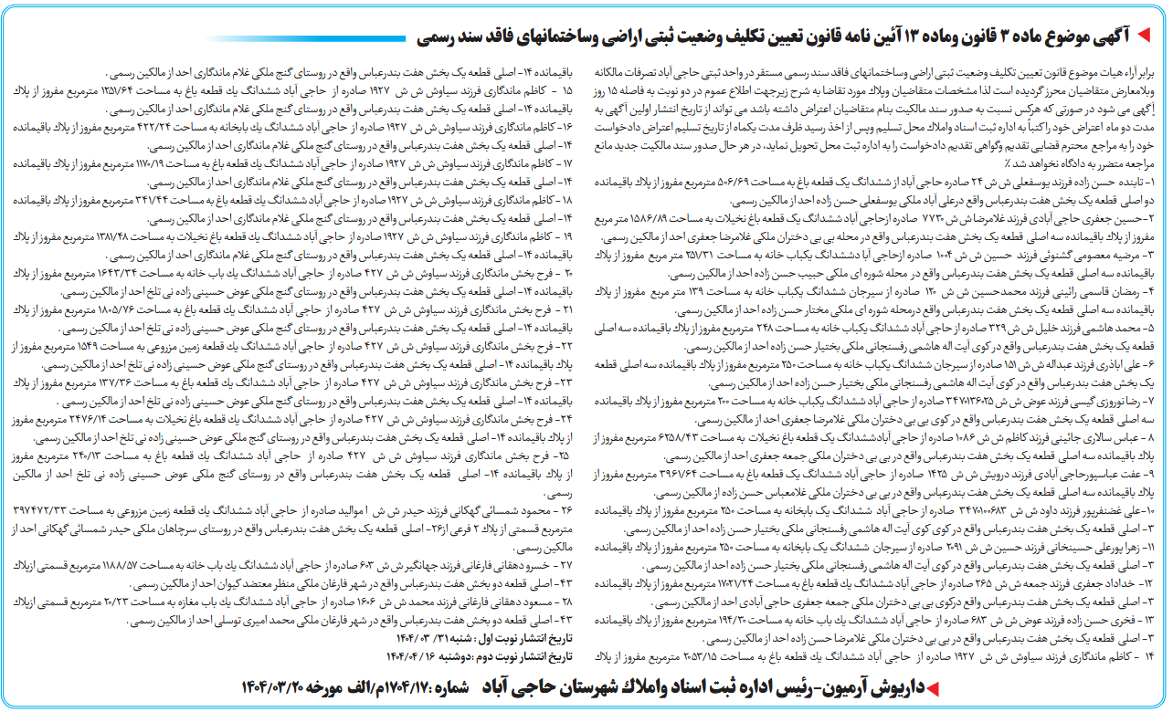 برابر آراء هیات موضوع قانون تعیین تكلیف وضعیت ثبتی اراضی وساختمانهای فاقد سند رسمی مستقر در واحد ثبتی حاجی آباد تصرفات مالكانه وبلامعارض متقاضیان محرز گردیده است لذا مشخصات متقاضیان وپلاك مورد تقاضا به شرح زیرجهت اطلاع عموم در دو نوبت به فاصله 15 روز آْگهی می شود در صورتی كه هركس نسبت به صدور سند مالكیت بنام متقاضیان اعتراض داشته باشد می تواند از تاریخ انتشار اولین آگهی به مدت دو ماه اعتراض خود را كتباً به اداره ثبت اسناد واملاك محل تسلیم وپس از اخذ رسید ظرف مدت یكماه از تاریخ تسلیم اعتراض دادخواست خود را به مراجع محترم قضایی تقدیم وگواهی تقدیم دادخواست را به اداره ثبت محل تحویل نماید، در هر حال صدور سند مالكیت جدید مانع مراجعه متضرر به دادگاه نخواهد شد %