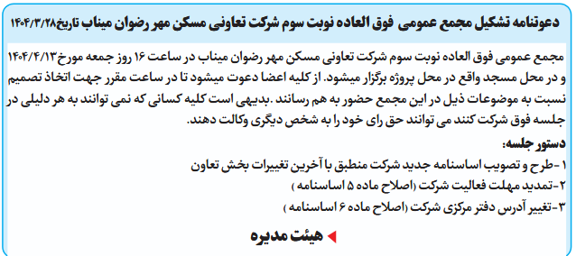 مجمع عمومی فوق العاده نوبت سوم شرکت تعاونی مسکن مهر رضوان میناب در ساعت 16روزجمعه مورخ 1404/4/13 و در محل مسجد واقع در محل پروژه برگزار میشود. از کلیه اعضا دعوت میشود تا در ساعت مقرر جهت اتخاذ تصمیم نسبت به موضوعات ذیل در این مجمع حضور به هم رسانند .بدیهی است کلیه کسانی که نمی توانند به هر دلیلی درجلسه فوق شرکت کنند می توانند حق رای خود را به شخص دیگری وکالت دهند دستور جلسه:
