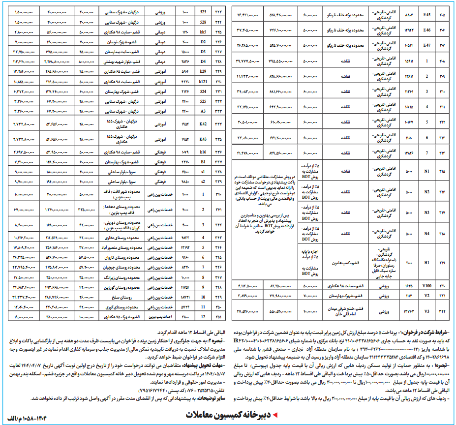 تجاری ،مختلط و ... را از طریق فراخوان عمومی به اشخاص حقیقی و حقوقی واجد شرایط وا گذار نماید. قیمت پایه هر قطعه طبق لیست ( ذیل )