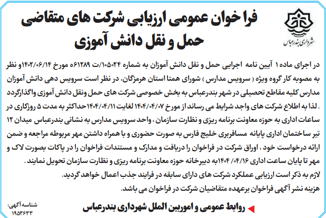 وا گذارگردد دانش آموزی ونقل حمل های شرکت خصوصی بخش به در شهر بندرعباس تحصیلی مقاطع مدارس کلیه