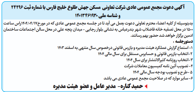 راس ساعت1404/04/17بدینوسیله از کلیه اعضاء محترم تعاونی دعوت بعمل می آید تا در جلسه مجمع عمومی عادی که در مورخ
