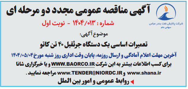 آ گهی مناقصه عمومی مجدد دو مرحله ای نوبت اولموضوع آ گهی: تعمیرات اساسی یک دستگاه جرثقیل 40 تن کاتو