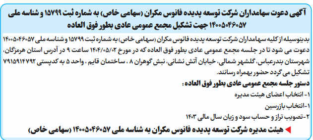 بدینوسیله از کلیه سهامداران شرکت توسعه پدیده فانوس مکران (سهامی خاص) به شماره ثبت ۱۵۷۹۹ و شناسه ملی ۱۴۰۰۵۰۴۶۰۵۷ دعوت می شود تا در جلسه مجمع عمومی عادی بطور فوق العاده که در مورخ 02/05/1404 ساعت 9 در آدرس استان هرمزگان، شهرستان بندرعباس، گلشهر شمالی، خیابان آتش نشانی، نبش گوهران ۸ ، ساختمان قایم ، واحد ۵ به کدپستی ۷۹۱۵۹۱۴۷۹۲ تشکیل می گردد حضور بهمراه رسانند.