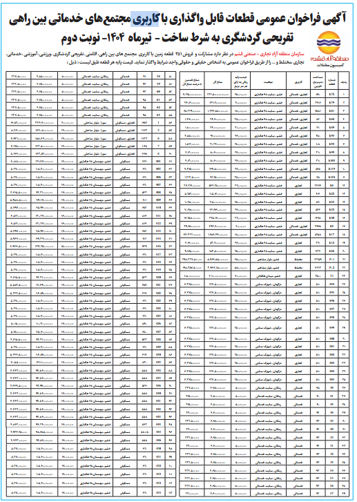 سازمان منطقه آزاد تجاری - صنعتی قشم در نظر دارد مشارکت و فروش 351 قطعه زمین با کاربری مجتمع های بین راهی، اقامتی ،تفریحی گردشگری ،ورزشی، آموزشی ،خدماتی، تجاری ،مختلط و ... را از طریق فراخوان عمومی به اشخاص حقیقی و حقوقی واجد شرایط واگذار نماید. قیمت پایه هر قطعه طبق لیست ( ذیل )