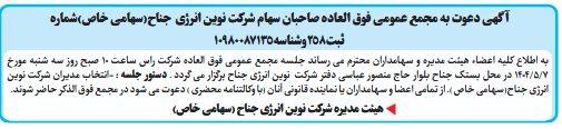 به اطلاع کلیه اعضاء هیئت مدیره و سهامداران محترم می رساند جلسه مجمع عمومی فوق العاده شرکت راس ساعت 10 صبح روز سه شنبه مورخ 7/5/1404 در محل بستک جناح بلوار حاج منصور عباسی دفتر شرکت نوین انرژی جناح برگزار می گردد . دستور جلسه : -انتخاب مدیران شرکت نوین انرژی جناح(سهامی خاص ). از تمامی اعضا و سهامداران یا نماینده قانونی آنان (با وکالتنامه محضری ) دعوت می شود در مجمع فوق الذکر حاضر شوند.