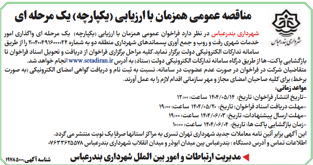 شهرداری بندرعباس در نظر دارد فراخوان عمومی همزمان با ارزیابی (یکپارچه) یک مرحله ای واگذاری امور خدمات شهری رفت و روب و جمع آوری پسماندهای شهرداری منطقه دو به شماره 2004004916000024 را از طریق سامانه تدارکات الکترونیکی دولت برگزار نماید.کلیه مراحل برگزاری فراخوان از دریافت و تحویل اسناد فراخوان تا بازگشایی پاکت¬ها از طریق درگاه سامانه تدارکات الکترونیکی دولت (ستاد) به آدرس www.setadiran.ir انجام خواهد شد.