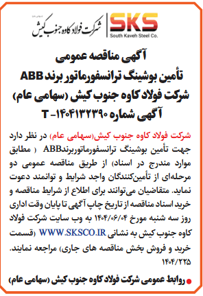 شركت فولاد کاوه جنوب کیش(سهامی عام) در نظر دارد جهت تأمین بوشینگ ترانسفورماتوربرندABB ( مطابق موارد مندرج در اسناد) از طريق مناقصه عمومى دو مرحلهای از تأمینکنندگان واجد شرایط و توانمند دعوت نماید. متقاضیان میتوانند برای اطلاع از شرایط مناقصه و خرید اسناد مناقصه از تاریخ چاپ آگهی تا پایان وقت اداری روز سه شنبه مورخ 04/06/1404 به وب سایت شرکت فولاد کاوه جنوب کیش به نشانی WWW.SKSCO.IR (قسمت خرید و فروش بخش مناقصه های جاری) مراجعه نمایند.