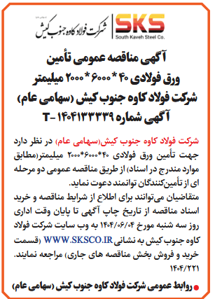 شركت فولاد کاوه جنوب کیش(سهامی عام) در نظر دارد جهت تأمین ورق فولادی 40*6000*2000 میلیمتر(مطابق موارد مندرج در اسناد) از طريق مناقصه عمومى دو مرحله ای از تأمینکنندگان توانمند دعوت نماید.