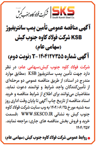 شركت فولاد کاوه جنوب کیش(سهامی عام) در نظر دارد جهت تأمین پمپ سانتریفیوژ KSB (مطابق موارد مندرج در اسناد) از طريق مناقصه عمومى دو مرحلهای از تأمینکنندگان واجد شرایط و توانمند دعوت نماید. متقاضیان میتوانند برای اطلاع از شرایط مناقصه و خرید اسناد مناقصه از تاریخ چاپ آگهی تا پایان وقت اداری روز سه شنبه مورخ 25/06/1404 به وب سایت شرکت فولاد کاوه جنوب کیش به نشانی WWW.SKSCO.IR (قسمت خرید و فروش بخش مناقصه های جاری) مراجعه نمایند.
