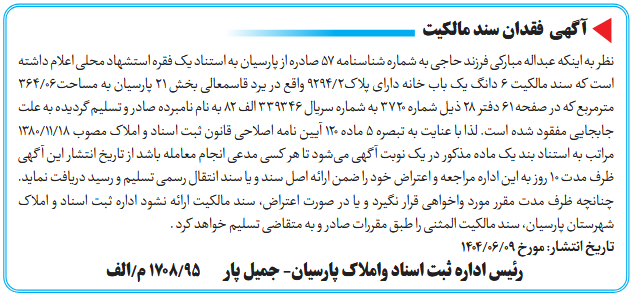 نظر به اینکه عبداله مبارکی فرزند حاجی به شماره شناسنامه 57 صادره از پارسیان به استناد یک فقره استشهاد محلی اعلام داشته است که سند مالکیت 6 دانگ یک باب خانه دارای پلاک2/9294 واقع در یرد قاسمعالی بخش 21 پارسیان به مساحت06/364 مترمربع که در صفحه 61 دفتر 28 ذیل شماره 3720 به شماره سریال 339346 الف 82 به نام نامبرده صادر و تسلیم گردیده به علت جابجایی مفقود شده است. لذا با عنایت به تبصره 5 ماده 120 آیین نامه اصلاحی قانون ثبت اسناد و املاک مصوب 18/11/1380 مراتب به استناد بند یک ماده مذکور در یک نوبت آگهی میشود تا هر کسی مدعی انجام معامله باشد از تاریخ انتشار این آگهی ظرف مدت 10 روز به این اداره مراجعه و اعتراض خود را ضمن ارائه اصل سند و یا سند انتقال رسمی تسلیم و رسید دریافت نماید. چنانچه ظرف مدت مقرر مورد واخواهی قرار نگیرد و یا در صورت اعتراض، سند مالکیت ارائه نشود اداره ثبت اسناد و املاک شهرستان پارسیان، سند مالکیت المثنی را طبق مقررات صادر و به متقاضی تسلیم خواهد کرد .