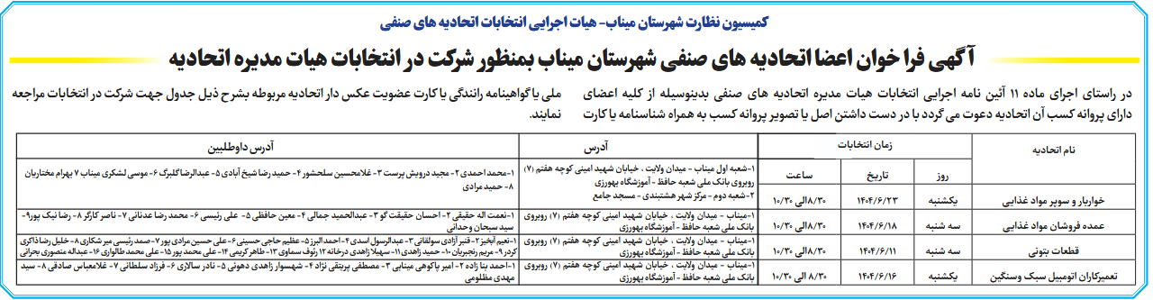آگهی فرا خوان اعضا اتحادیه های صنفی شهرستان میناب بمنظور شرکت در انتخابات هیات مدیره اتحادیه