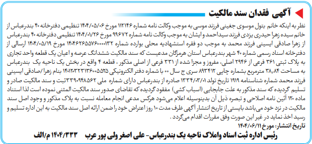 نظر به اینکه خانم بتول موسوی جغینی فرزند موسی به موجب وکالت نامه شماره 112146 مورخ 06/05/1404 تنظیمی دفترخانه 40 بندرعباس از خانم سیده زهرا حیدری یزدی فرزند سیداحمد و ایشان به موجب وکالت نامه شماره 99672 مورخ 26/01/1404 تنظیمی دفترخانه 40 بندرعباس از زهرا صادقی ایسینی فرزند محمد به موجب دو فقره استشهادیه محلی بوارده شماره 140462655760000132 مورخ 19/05/1404 ارسالی از دفترخانه اسناد رسمی شماره 40 شهر بندرعباس استان هرمزگان مدعیست که سند مالکیت ششدانگ عرصه و اعیان یک قطعه واحد تجاری به پلاک ثبتی 361 فرعی از 2946 اصلی، مفروز و مجزا شده از 331 فرعی از اصلی مذکور ، قطعه 4 واقع در بخش یک ناحیه یک بندرعباس