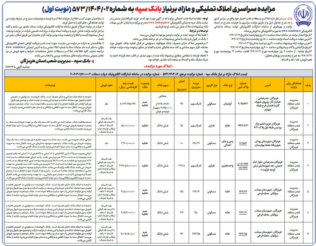 مزایده سراسری املاک تملیکی و مازاد برنیاز بانک سپه به شماره02/1404/573 (نوبت اول)