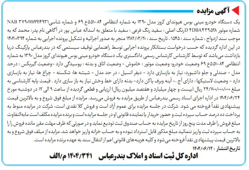 یک دستگاه خودرو مینی بوس هیوندای کروز مدل ۱۳۹۰ به شماره انتظامی ۸۴-۵۵۱ع ۶۹ و شماره شاسی37901789914931 NAB شماره موتور ۴DBA۴۳۹۵۲۸ Dرنگ اصلی : سفید رنگ فرعی : سفید با متعلق به اسداله عباس پور در آگاهی نام پدر: محمد که به موجب سند ازدواج : شماره سند : ۱۵۴۵ ، تاریخ سند : 20/۰۳/1382 منجر به صدور اجرائیه و تشکیل پرونده اجرایی به شماره ۱۴۰۳۰۰۳۹۴ در این اداره گردیده که حسب درخواست بستانکار پرونده اجرایی توسط راهنمایی توقیف سیستمی که در بندرعباس پارکینگ دریا بازداشت میباشد که توسط کارشناس کارشناس رسمی دادگستری یک دستگاه خودرو مینی بوس هیوندای کروز مدل ۱۳۹۰ به شماره انتظامی ۸۴-۵۵۱ع ۶۹ وضعیت خودرو: وضعیت موتور : خاموش - وضعیت اتاق و بدنه : پوسیدگی دارد -وضعیت گیربکس : درحد مدل - صندلی و جلو داشبورد: نیاز به بازسازی دارد - ديفر انسیل : در حد مدل - شیشه ها: شکسته - چراغ ها: نیاز به بازسازی دارد - وضعیت لاستیکها : دارای آج .- آینه وبرف پاکن دارد- بدنه دارای خط وخش نیاز به باز سازی دارد . قیمت پایه کارشناسی به مبلغ 000/000/700/24 ریال (بیست و چهار میلیارد و هفتصد میلیون ریال) ارزیابی و قطعی گردیده از ساعت ۹ الی ۱۲ در دوشنبه مورخ 24/۰۶/1404 در اداره اجرای اسناد رسمی بندرعباس از طریق مزایده به فروش میرسد. مزایده از مبلغ فوق شروع و به بالاترین قیمت پیشنهادی نقداً فروخته می شود. شرکت در جلسه مزایده برای عموم آزاد است و فروش کلا نقدی است، شرکت در مزایده منوط به پرداخت ده درصد حساب سپرده ثبت و حضور خریدار یا نماینده قانونی او در جلسه مزایده است و برنده مزایده مکلف است مابهالتفاوت مبلغ فروش را ظرف مدت پنج روز از تاریخ مزایده به حساب صندوق ثبت تودیع نماید و در صورتی که ظرف مهلت مقرر مانده فروش را را به حساب سپرده ثبت واریز ننمائید مبلغ مذکور قابل استرداد نبوده و به حساب خزانه واریز خواهد شد، مزایده از مبلف فوق شروع و به بالاترین قیمت پیشنهادی نقداً فروخته میشود و کلیه هزینههای قانونی اعم از انتقال سند به عهده برنده مزایده است.