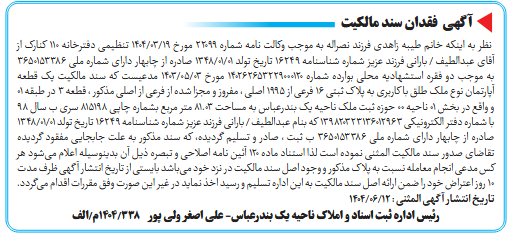 نظر به اینکه خانم طیبه زاهدی فرزند نصراله به موجب وکالت نامه شماره ۲۲۰۹۹ مورخ 19/۰۳/1404 تنظیمی دفترخانه ۱۱۰ کنارک از آقای عبدالطیف / بارانی فرزند عزیز شماره شناسنامه ۱۶۲۴۹ تاریخ تولد ۰۱/۰۱/۱۳۴۸ صادره از چابهار دارای شماره ملی ۳۶۵۰۱۵۳۳۸۶ به موجب دو فقره استشهادیه محلی بوارده شماره ۱۴۰۲۶۲۶۵۳۲۲۹۰۰۰۱۲۰ مورخ 03/۰۵/1403 مدعیست که سند مالکیت یک قطعه آپارتمان نوع ملک طلق با کاربری به پلاک ثبتی ۱۶ فرعی از ۱۹۹۵ اصلی ، مفروز و مجزا شده از فرعی از اصلی مذکور ، قطعه ۳ در طبقه ۰۱ و واقع در بخش ۰۱ ناحیه 00 حوزه ثبت ملک ناحیه یک بندرعباس به مساحت ۸۱.۰۳ متر مربع بشماره چاپی ۸۱۵۱۹۸ سری ب سال ۹۸ با شماره دفتر الکترونیکی 139820323136012963 که بنام عبدالطیف / بارانی فرزند عزیز شماره شناسنامه ۱۶۲۴۹ تاریخ تولد ۰۱/۰۱/۱۳۴۸ صادره از چابهار دارای شماره ملی ۳۶۵۰۱۵۳۳۸۶ ب ثبت ، صادر و تسلیم گردیده، که سند مذکور به علت جابجایی مفقود گردیده تقاضای صدور سند مالکیت المثنی نموده است لذا استناد ماده ۱۲۰ آئین نامه اصلاحی و تبصره ذیل آن بدینوسیله اعلام میشود هر کس مدعی انجام معامله نسبت به پلاک مذکور و وجود اصل سند مالکیت در نزد خود میباشد بایستی از تاریخ انتشار آگهی ظرف مدت ۱۰ روز اعتراض خود را ضمن ارائه اصل سند مالکیت به این اداره تسلیم و رسید اخذ نماید در غیر این صورت وفق مقررات اقدام میگردد.