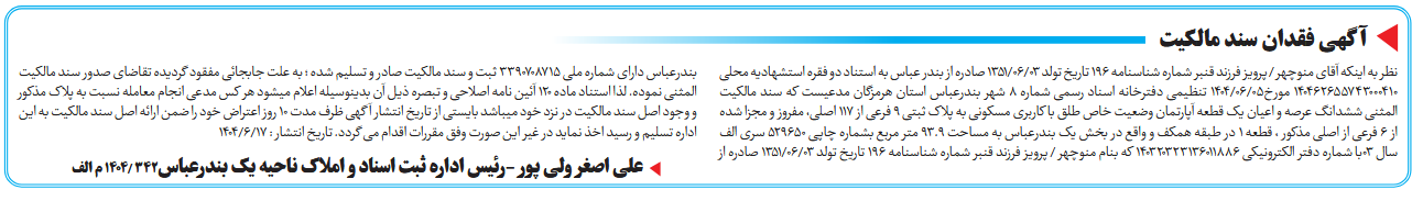 نظر به اینکه آقای منوچهر / پرویز فرزند قنبر شماره شناسنامه ۱۹۶ تاریخ تولد ۰۳/۰۶/۱۳۵۱ صادره از بندر عباس به استناد دو فقره استشهادیه محلی ۱۴۰۴۶۲۶۵۵۷۴۳۰۰۰۴۱۰ مورخ05/06/1404 تنظیمی دفترخانه اسناد رسمی شماره ۸ شهر بندرعباس استان هرمزگان مدعیست که سند مالکیت المثنی ششدانگ عرصه و اعیان یک قطعه آپارتمان وضعیت خاص طلق با کاربری مسکونی به پلاک ثبتی ۹ فرعی از ۱۱۷ اصلی، مفروز و مجزا شده از ۶ فرعی از اصلی مذکور ، قطعه ۱ در طبقه همکف و واقع در بخش یک بندرعباس به مساحت ۹۳.۹ متر مربع بشماره چاپی ۵۲۹۶۵۰ سری الف سال 03با شماره دفتر الکترونیکی ۱۴۰۳۲۰۳۲۳۱۳۶۰۱۱۸۸۶ که بنام منوچهر / پرویز فرزند قنبر شماره شناسنامه ۱۹۶ تاریخ تولد ۰۳/۰۶/۱۳۵۱ صادره از بندرعباس دارای شماره ملی ۳۳۹۰۷۰۸۷۱۵ ثبت و سند مالکیت صادر و تسلیم شده ؛ به علت جابجائی مفقود گردیده تقاضای صدور سند مالکیت المثنی نموده. لذا استناد ماده ۱۲۰ آئین نامه اصلاحی و تبصره ذیل آن بدینوسیله اعلام میشود هر کس مدعی انجام معامله نسبت به پلاک مذکور و وجود اصل سند مالکیت در نزد خود میباشد بایستی از تاریخ انتشار آگهی ظرف مدت ۱۰ روز اعتراض خود را ضمن ارائه اصل سند مالکیت به این اداره تسلیم و رسید اخذ نماید در غیر این صورت وفق مقررات اقدام می گردد. تاریخ انتشار : 17/6/1404