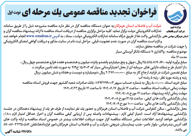 شركت آب و فاضلاب استان هرمزگانبه عنوان دستگاه مناقصه گزار در نظر دارد مناقصه مشروحه ذیل را از طریق سامانه تداركات الكترونیكی دولت برگزار نماید كلیه مراحل برگزاری مناقصه از دریافت اسناد مناقصه تا ارائه پیشنهاد مناقصه گران و بازگشایی پاكت ها از طریق درگاه سامانه تداركات الكترونیكی دولت ( ستاد ) به آدرس www.setadiran.ir انجام خواهد شد و لازم است مناقصه گران در صورت عدم عضویت قبلی , مراحل ثبت نام در سایت مذكور و دریافت گواهی امضای الكترونیكی را جهت شركت در مناقصه محقق سازند .