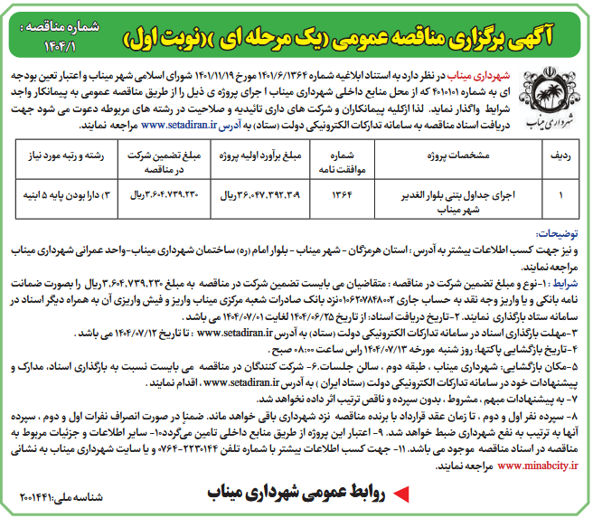 شهرداری میناب در نظر دارد به استناد ابلاغیه شماره 1364/6/1401 مورخ 19/11/1401 شورای اسلامی شهر میناب و اعتبار تعین بودجه ای به شماره 4010101 که از محل منابع داخلی شهرداری میناب ا جرای پروژه ی ذیل را از طریق مناقصه عمومی به پیمانکار واجد شرایط واگذار نماید. لذا ازكلیه پیمانكاران و شركت های داری تائیدیه و صلاحیت در رشته های مربوطه دعوت می شود جهت دریافت اسناد مناقصه به سامانه تدارکات الکترونیکی دولت (ستاد) به آدرس www.setadiran.ir مراجعه نمایند.