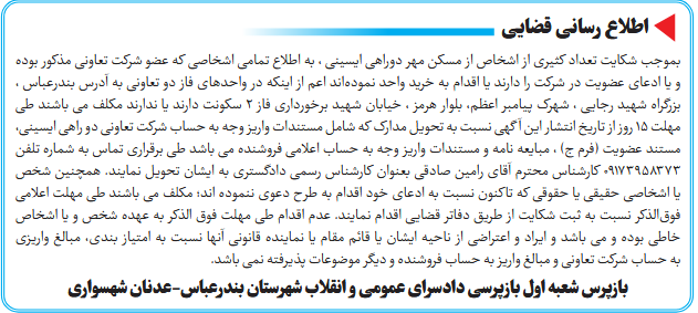 بموجب شکایت تعداد کثیری از اشخاص از مسکن مهر دوراهی ایسینی ، به اطلاع تمامی اشخاصی که عضو شركت تعاونی مذکور بوده و یا ادعای عضویت در شرکت را دارند یا اقدام به خرید واحد نمودهاند اعم از اینکه در واحدهای فاز دو تعاونی به آدرس بندرعباس ، بزرگراه شهید رجایی ، شهرک پیامبر اعظم، بلوار هرمز ، خیابان شهید برخورداری فاز 2 سكونت دارند یا ندارند مکلف می باشند طی مهلت 15 روز از تاریخ انتشار این آگهی نسبت به تحویل مدارک که شامل مستندات واریز وجه به حساب شرکت تعاونی دو راهی ایسینی، مستند عضویت (فرم ج) ، مبایعه نامه و مستندات واریز وجه به حساب اعلامی فروشنده می باشد طی برقراری تماس به شماره تلفن 09173958373 کارشناس محترم آقای رامین صادقی بعنوان کارشناس رسمی دادگستری به ایشان تحویل نمایند. همچنین شخص یا اشخاصی حقیقی یا حقوقی که تاکنون نسبت به ادعای خود اقدام به طرح دعوی ننموده اند؛ مكلف می باشند طی مهلت اعلامی فوقالذكر نسبت به ثبت شکایت از طریق دفاتر قضایی اقدام نمایند. عدم اقدام طی مهلت فوق الذكر به عهده شخص و یا اشخاص خاطی بوده و می باشد و ایراد و اعتراضی از ناحیه ایشان یا قائم مقام یا نماینده قانونی آنها نسبت به امتیاز بندی، مبالغ واریزی به حساب شرکت تعاونی و مبالغ واریز به حساب فروشنده و دیگر موضوعات پذیرفته نمی باشد.