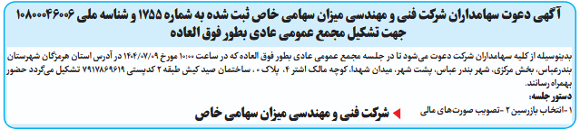 آگهی دعوت سهامداران جهت تشکیل مجمع عمومی عادی بطور فوق العاده