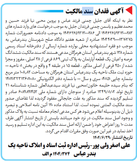 نظر به اینکه آقای جلیل چمنی فرزند عباس و پروین محبی نیا فرزند حسین و محمدعظیم و یاسمن چمنی فرزندان جلیل به موجب درخواست های وارد شماره های 140462659313000283 الی 140462659313000286 به موجب دادنامه حصروراثت شماره 140440390001370275 صادره از شعبه هفتم دادگاه صلح شهرستان بندرعباس به موجب دو فقره استشهادیه محلی بوارده شماره ارسالی از دفترخانه اسناد رسمی شماره 138 شهر بندرعباس استان هرمزگان مدعی هستند که سند مالکیت ششدانگ عرصه و اعیان یک قطعه آپارتمان به پلاک ثبتی 869 فرعی از 38 اصلی، مفروز و مجزا شده از 450 فرعی از اصلی مذکور ، قطعه 15 در طبقه 4 و واقع در بخش ۰۱ ناحیه ۰۰ حوزه ثبت ملک ناحیه یک بندرعباس استان هرمزگان به مساحت 108.82 متر مربع بشماره چاپی 040151 سری و سال 00 با شماره دفتر الکترونیکی 140120323136011080 که بنام سیده حلیمه خاتون/محبی نیا فرزند سیدعبدالعلی شماره شناسنامه 21 تاریخ تولد 02/01/1349 صادره از منوجان دارای شماره ملی 6089891452 صادر و تسلیم گردیده که سند مذکور به علت جابجائی مفقود گردیده لذا تقاضای صدور سند مالکیت المثنی نموده است. لذا استناد ماده ۱۲۰ آئین نامه اصلاحی و تبصره ذیل آن بدینوسیله اعلام میشود هر کس مدعی انجام معامله نسبت به پلاک مذکور و وجود اصل سند مالکیت در نزد خود میباشد بایستی از تاریخ انتشار آگهی ظرف مدت ۱۰ روز اعتراض خود را ضمن ارائه اصل سند مالکیت به این اداره تسلیم و رسید اخذ نماید در غیر این صورت وفق مقررات اقدام می گردد.