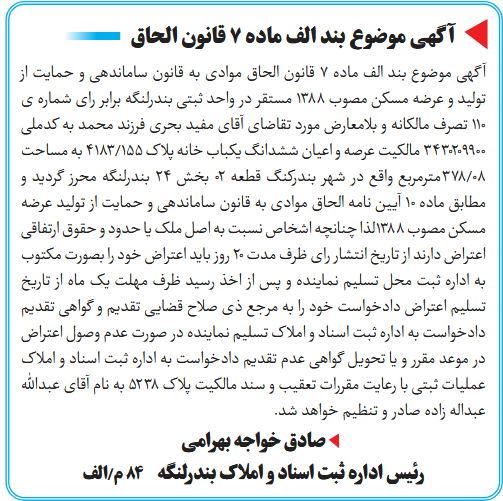 آگهی موضوع بند الف ماده ۷ قانون الحاق موادی به قانون ساماندهی و حمایت از تولید و عرضه مسکن مصوب ۱۳۸۸ مستقر در واحد ثبتی بندرلنگه برابر رای شماره ی 110 تصرف مالکانه و بلامعارض مورد تقاضای آقای مفید بحری فرزند محمد به کدملی 3430209900 مالکیت عرصه و اعیان ششدانگ یکباب خانه پلاک 155/4183 به مساحت 08/378مترمربع واقع در شهر بندرکنگ قطعه 02 بخش ۲۴ بندرلنگه محرز گردید و مطابق ماده ۱۰ آیین نامه الحاق موادی به قانون ساماندهی و حمایت از تولید عرضه مسکن مصوب ۱۳۸۸لذا چنانچه اشخاص نسبت به اصل ملک یا حدود و حقوق ارتفاقی اعتراض دارند از تاریخ انتشار رای ظرف مدت ۲۰ روز باید اعتراض خود را بصورت مکتوب به اداره ثبت محل تسلیم نماینده و پس از اخذ رسید ظرف مهلت یک ماه از تاریخ تسلیم اعتراض دادخواست خود را به مرجع ذی صلاح قضایی تقدیم و گواهی تقدیم دادخواست به اداره ثبت اسناد و املاک تسلیم نماینده در صورت عدم وصول اعتراض در موعد مقرر و یا تحویل گواهی عدم تقدیم دادخواست به اداره ثبت اسناد و املاک عملیات ثبتی با رعایت مقررات تعقیب و سند مالکیت پلاک 5238 به نام آقای عبدالله عبداله زاده صادر و تنظیم خواهد شد.