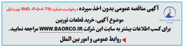 آگهی مناقصه عمومی بدون اخذ سپرده نوبت اولموضوع آگهی: خرید قطعات توربین