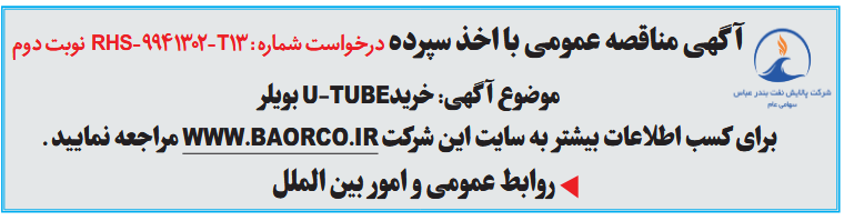 آگهی مناقصه عمومی با اخذ سپرده نوبت دومموضوع آگهی: خریدU-TUBE بویلر