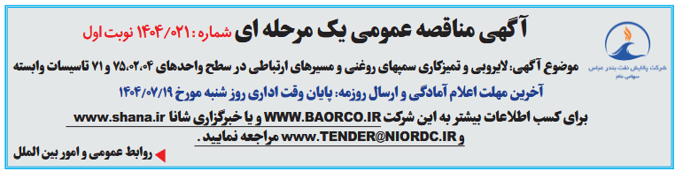 موضوع آگهی: لایروبی و تمیزکاری سمپهای روغنی و مسیرهای ارتباطی در سطح واحدهای 75،02،04 و 71 تاسیسات وابسته