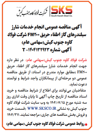 شركت فولاد کاوه جنوب کیش(سهامی عام) در نظر دارد جهت انجام خدمات شارژ سیلندرهای گاز اطفاء حریق FM200 (مطابق موارد مندرج در اسناد) از طريق مناقصه عمومى دو مرحلهای از پیمانکاران واجد شرایط و توانمند دعوت نماید. متقاضیان میتوانند برای اطلاع از شرایط مناقصه و خرید اسناد مناقصه از تاریخ چاپ آگهی تا پایان وقت اداری روز سه شنبه مورخ 15/07/1404 به وب سایت شرکت فولاد کاوه جنوب کیش به نشانی WWW.SKSCO.IR (قسمت خرید و فروش بخش مناقصه های جاری) مراجعه نمایند.
