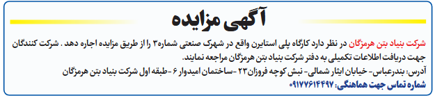 شرکت بنیاد بتن هرمزگان در نظر دارد کارگاه پلی استایرن واقع در شهرک صنعتی شماره3 را از طریق مزایده اجاره دهد . شرکت کنندگان جهت دریافت اطلاعات تکمیلی به دفتر شرکت بنیاد بتن هرمزگان مراجعه نمایند.
